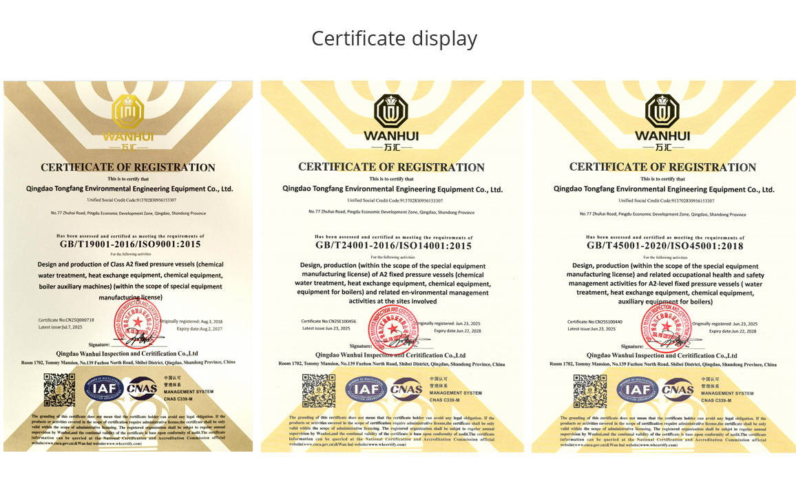 Qingdao Tongfang Environmental Engineering Equipment Co., Ltd. is invested and established by Qingdao Tongfang Thermal Power Equipment Co., Ltd., located in Pingdu Economic Development Zone, Qingdao. It covers an area of ??40,114 square meters and has a workshop area of ??20,000 square meters. It was founded in 1985 and has more than 30 years. The design, production and installation experience is mainly for the production of large-scale reverse osmosis water treatment equipment, seawater desalination, sewage purification treatment equipment, chemical equipment, flue gas desulfurization equipment and other environmental protection equipment products, involving petrochemical, natural gas, metallurgy, municipal, electric power. , coal and coal chemical industry and other industries, with the A1, A2 grade pressure vessel manufacturing qualification approved by the General Administration of Quality Supervision, Inspection and Quarantine, the first in the industry passed the ISO9001 international quality system certification, was named "Enterprise Credit Rating AAA Credit Enterprise" "When the products are sold to most provinces in China and exported to India, Indonesia, Thailand, Niger, Ethiopia and other countries and regions in Asia and Africa, high-quality products and perfect after-sales service have won unanimous praise and recognition from the market and users. .